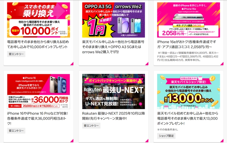 例えば、初めての申し込み限定、他社からの乗り換え限定、要エントリー、指定製品の購入が必要、開通後にRakuten Linkでの発信が必要など、様々な条件が設定されています。