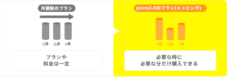 A2. トッピングとは、povo2.0の基本料金0円の状態から、データ容量や使い放題などを必要に応じて追加購入するオプションのことです。