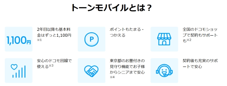 - 最強の見守り機能「TONEファミリー」があり、動画制限のおかげでスマホ依存も防げるからです。まさに子供のためのスマホといっても過言ではありません。動画は自宅のWi-Fiでしか見ない、節約志向のビジネスマン
