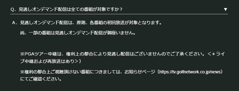 また、スカパー!にはスカパー!番組配信という契約チャンネルを見逃し配信しているサービスがありますが、こちらもPGAツアーに関しては見逃し配信対象外であるため注意が必要です。