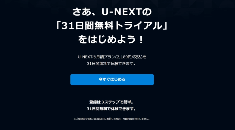 U-NEXTは31日間の無料トライアルがあり、期間内に解約すれば料金は一切かかりません。