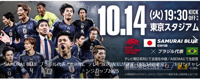 2025年10月14日(火) | 19:30 | 日本代表 vs ブラジル代表 | 東京スタジアム (東京) |