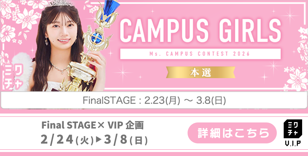 ●ライブ配信・動画投稿をする際は必ず[CAMPUS GIRLS 2026本選FinalSTAGE]のイベント選択をお願いします。正しく選択をしていない場合は獲得したミクチャポイントがランキングに反映されませんのでご注意ください。また、誤ってイベント選択した際にポイントを対象イベントに反映することはできかねますので予めご了承ください。