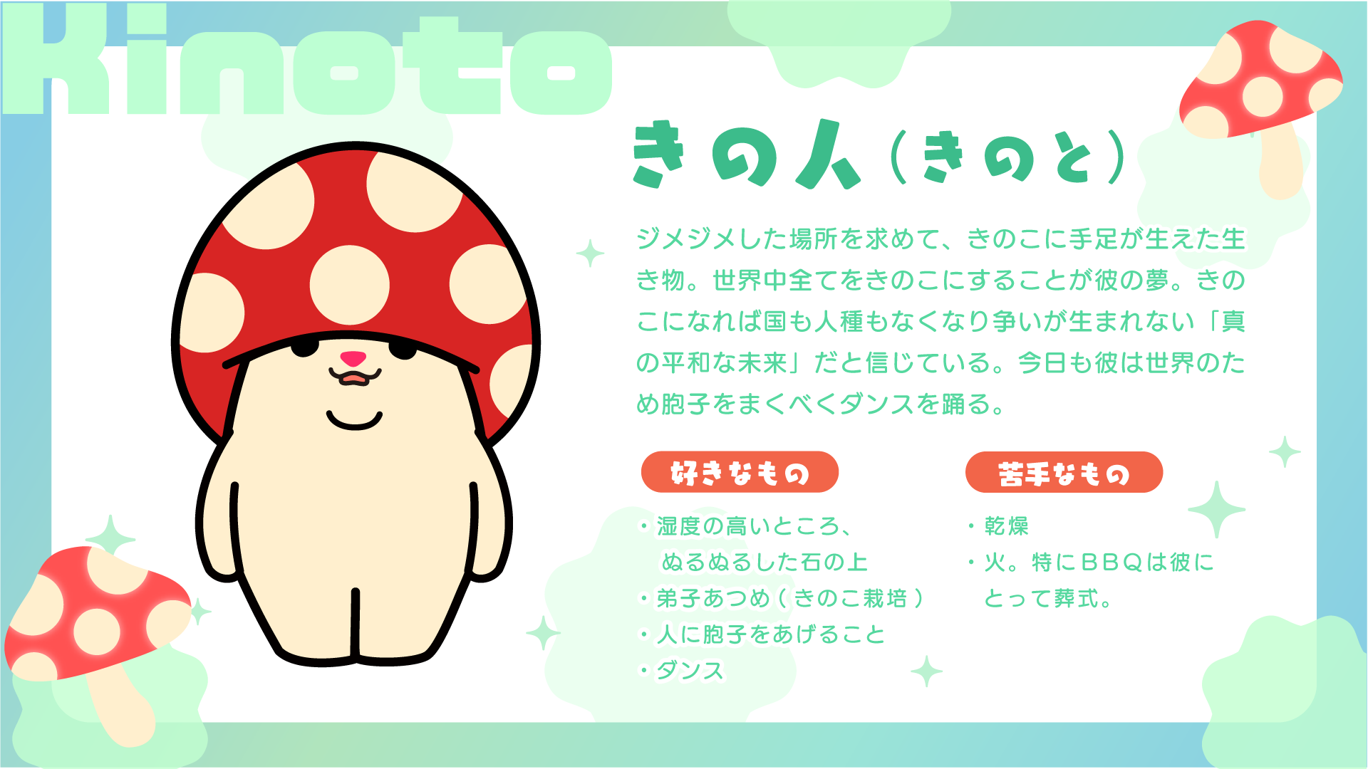 きのこになれば国も人種もなくなり争いが生まれない「真の平和な世界」だと信じている。