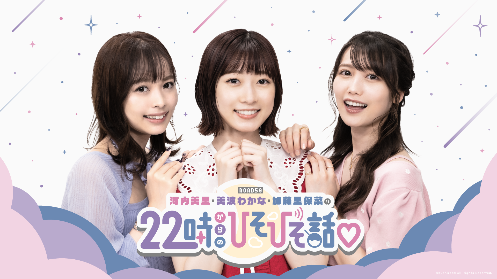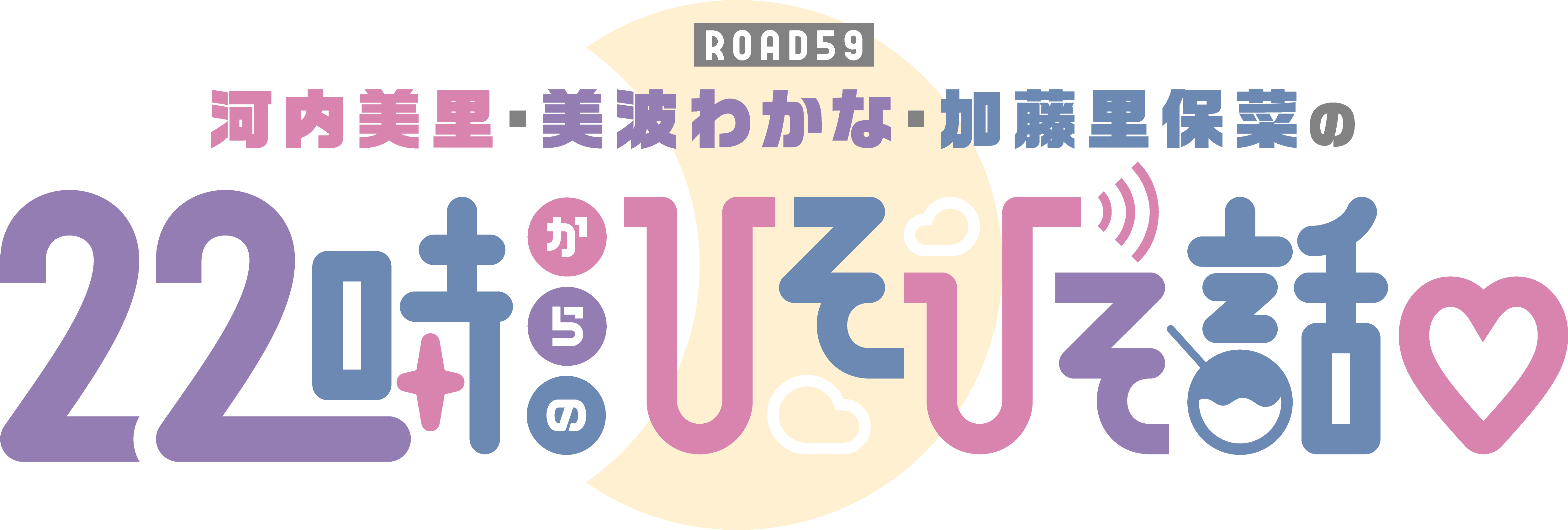 ブシロードのメディアミックスプロジェクト「ROAD59 -新時代任侠特区-」に出演する、河内美里 美波わかな 加藤里保菜 の3人が、休日終わりとなる日曜日の憂鬱な夜にユル~く寄り添う、とっておきの「ひそひそ話」をお届けするラジオ番組。
