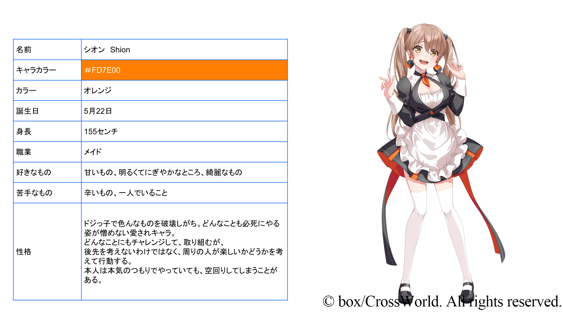 - オリジナルキャラクター「シオン」「カナデ」について、色味が異なる可能性がございますので、あらかじめご了承ください。