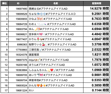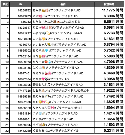 ⏰2〜3日目のみの”A〜C各ブロック”配信時間ランキング1位(計3名)