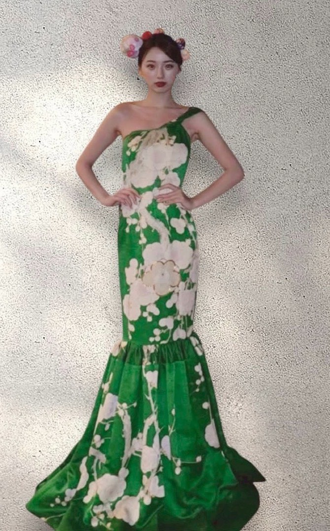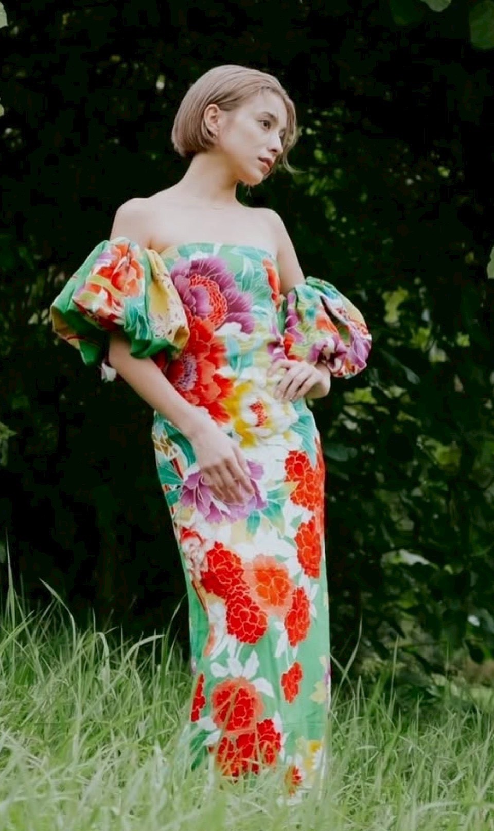 和装ドレスをまとい、ランウェイを歩くモデル。