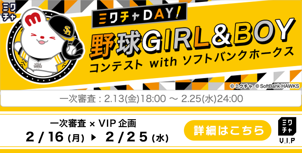 ●ライブ配信・動画投稿をする際は必ず[ 福岡ソフトバンクホークス【野球GIRL&BOYコンテスト 一次審査 ]のイベント選択をお願いします。正しく選択をしていない場合は獲得したミクチャポイントがランキングに反映されませんのでご注意ください。また、誤ってイベント選択した際にポイントを対象イベントに反映することはできかねますので予めご了承ください。