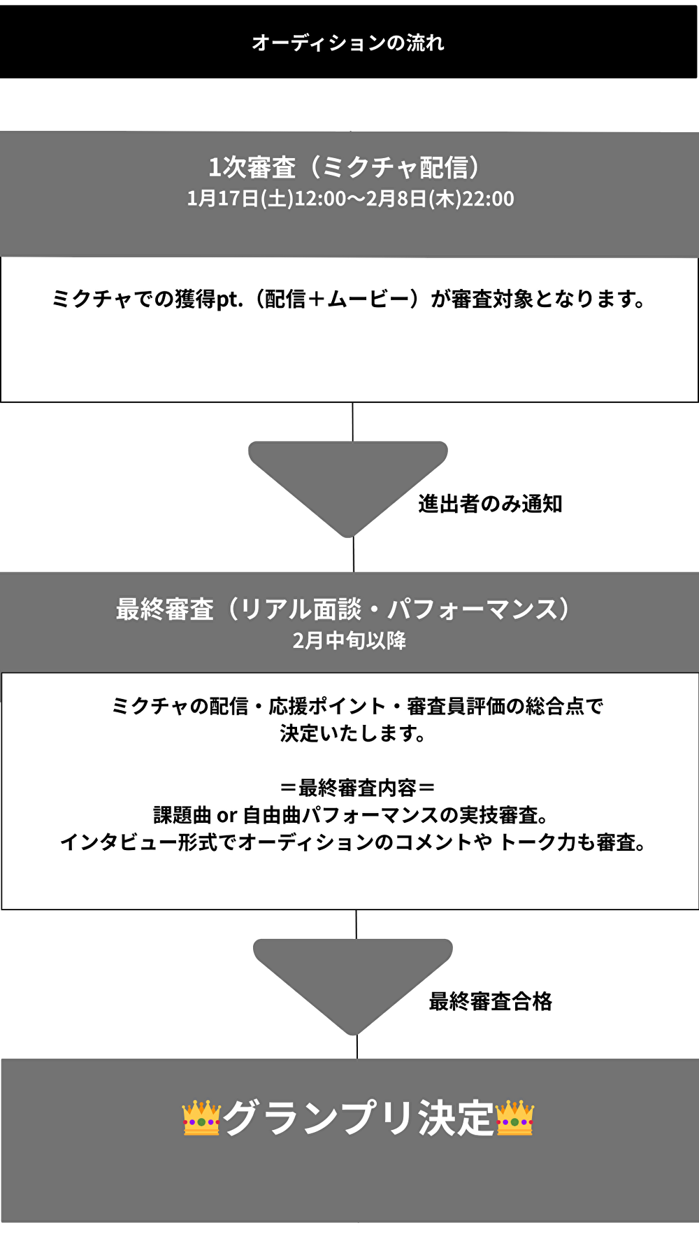 - 当オーディションにて得た情報やその他進行状況などは、主催の許可がない限りSNSへの投稿含む第三者への口外はご遠慮ください。 発覚の場合は失格になる可能性があります。