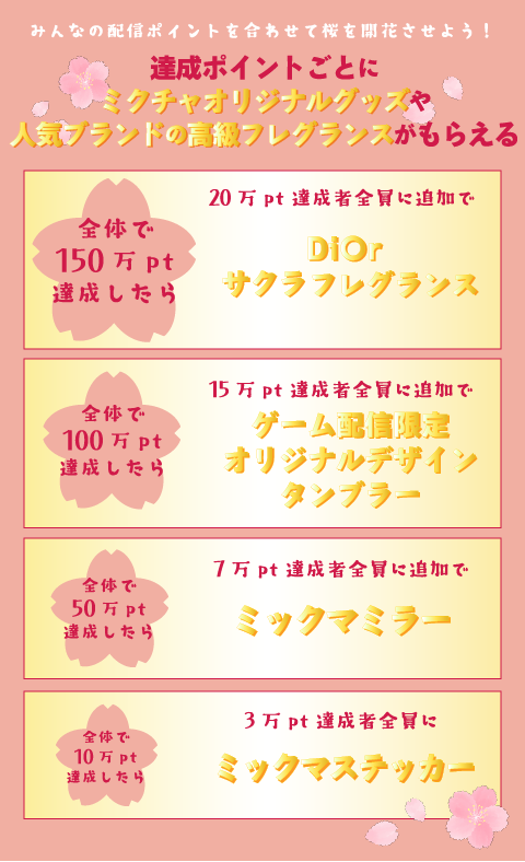 配信する際は必ず[春爛漫~ミクチャゲーム部のお花見企画~]のイベント選択をお願いします。