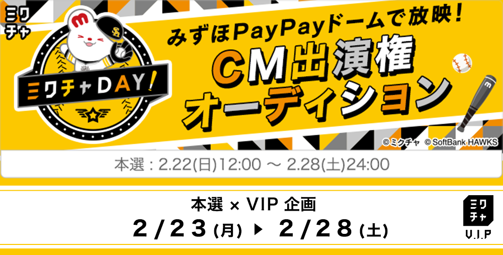 福岡ソフトバンクホークス【ミクチャDAY】みずほPayPayドームで放映!CM出演権オーディション×VIP企画(アプリ向け)
