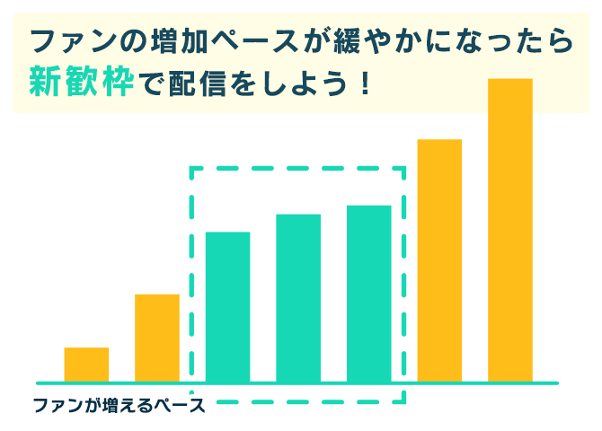ファンの増加がゆるやかになったタイミングで「新歓枠」で配信を行いましょう! - ファンを増やすペースをはやくしたいライバーは、通常配信の前の時間を使ってこまめに「新歓枠」で配信を行うことがおすすめです!