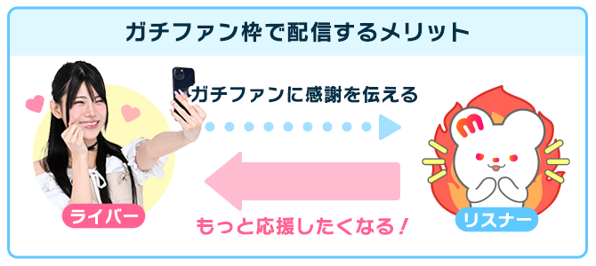 - 目標を達成したらガチファン枠で配信をして、応援してくれるリスナーさんとの絆をさらに深めましょう!