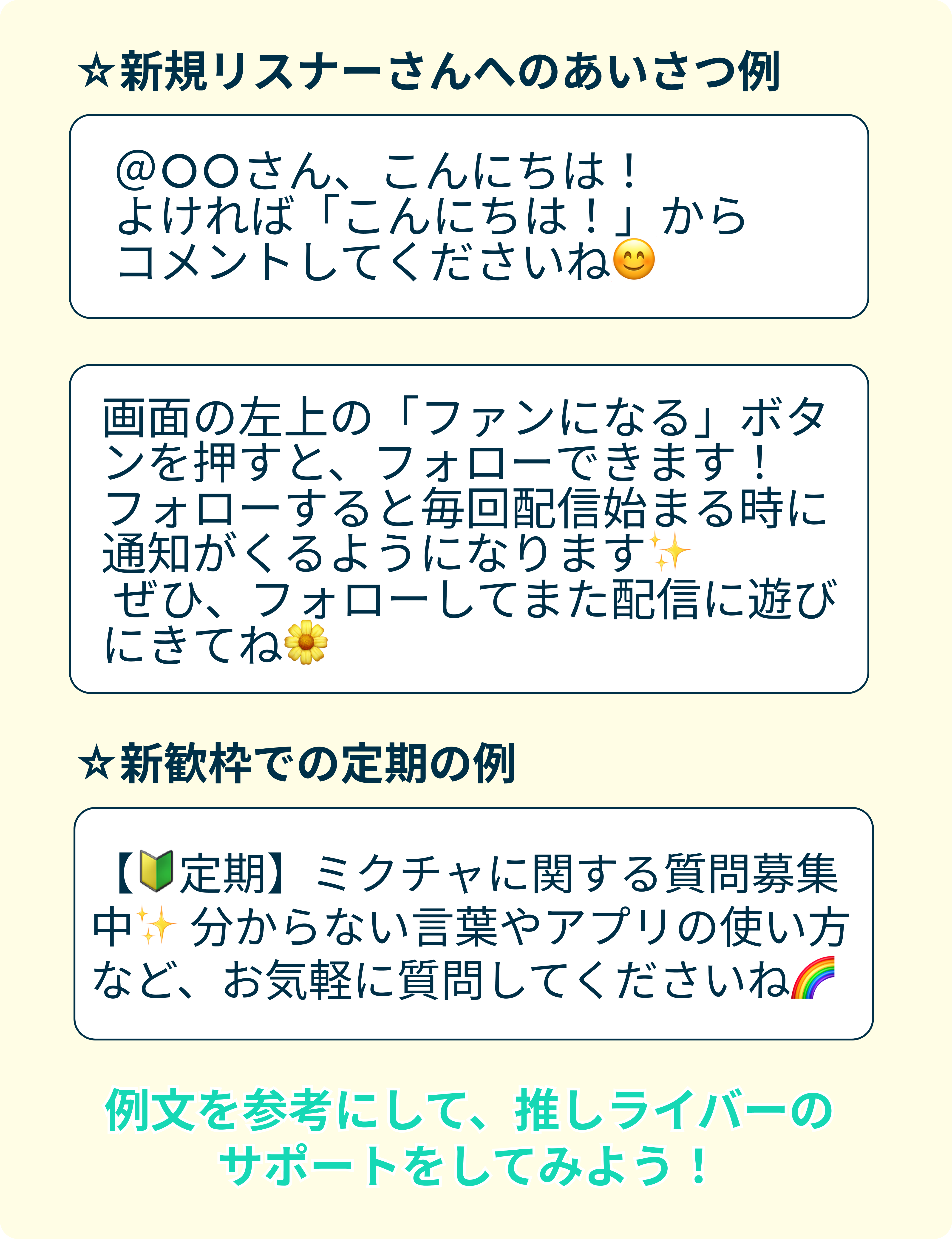 - 初見のリスナーさんが、配信になじみやすくなるように、リスナーさんが入室したらあいさつや自己紹介などの声掛けをするように心がけましょう!