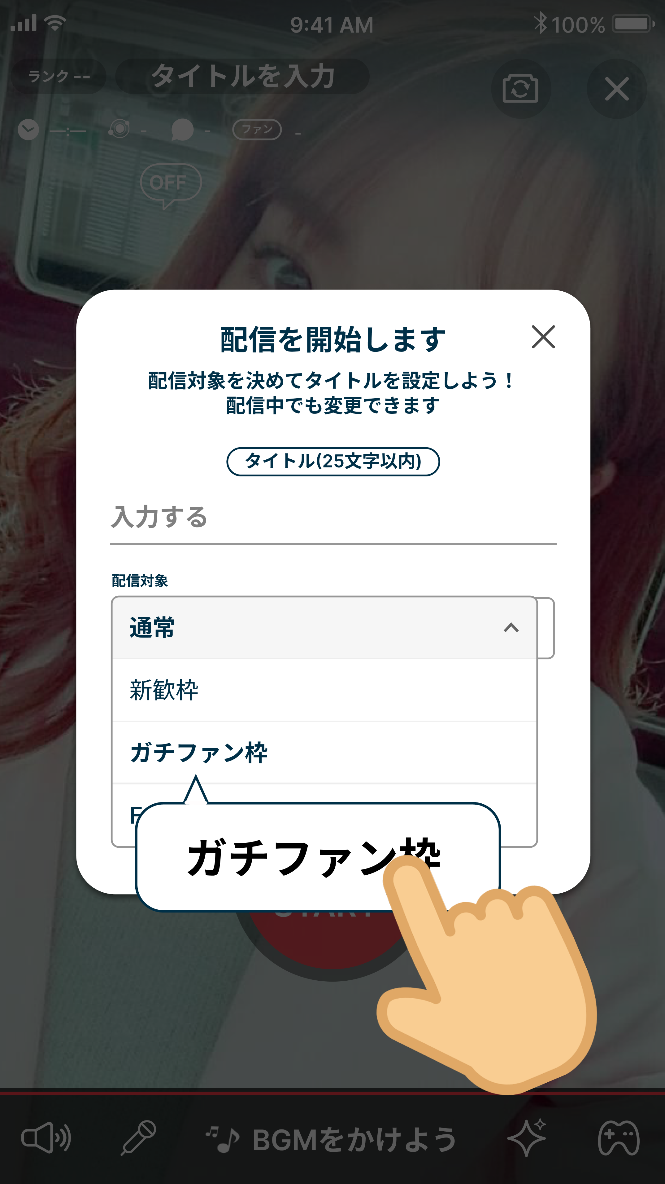 - 配信準備画面の配信設定で、「ガチファン枠」を選択します。