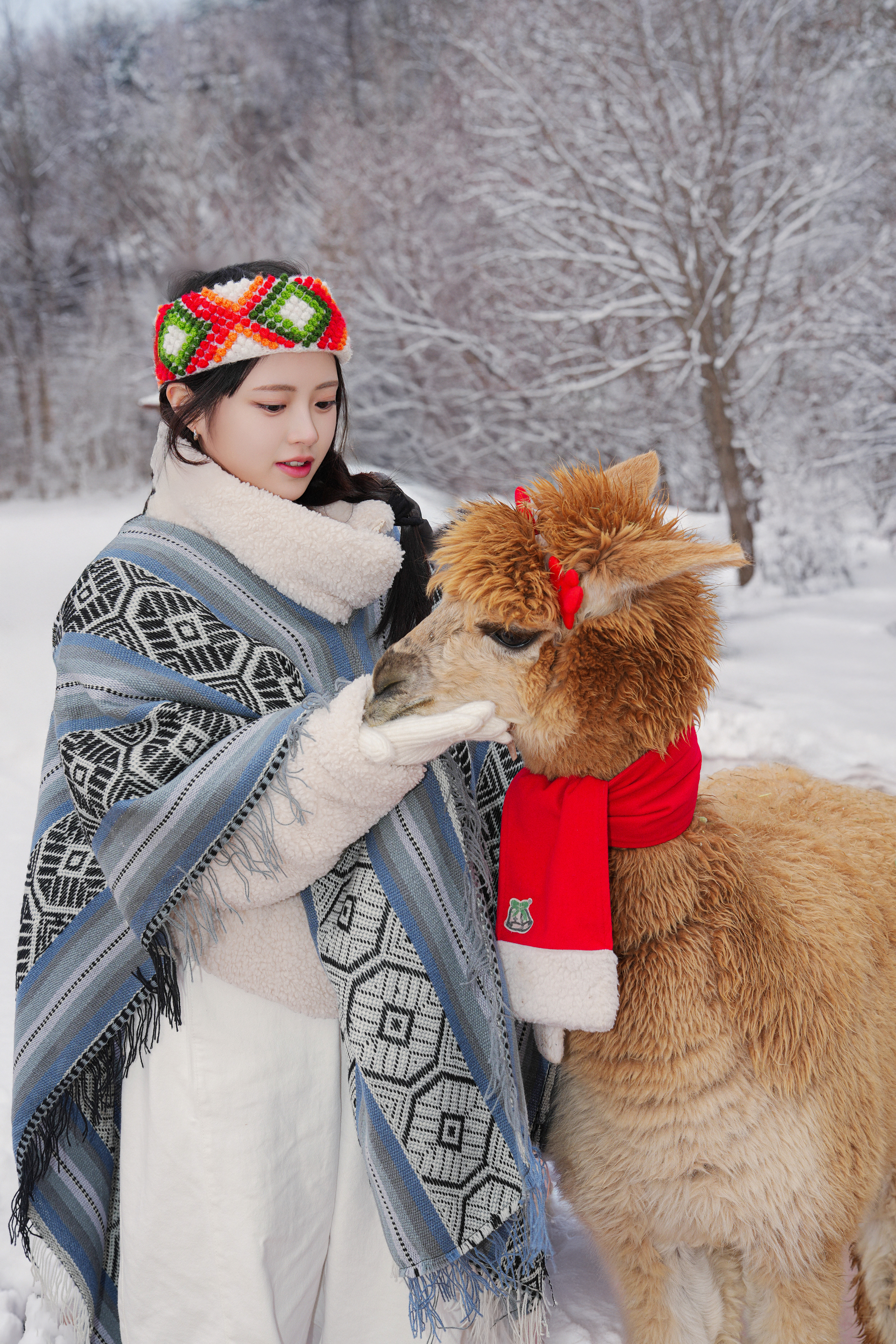 「白い雪に覆われた森の中、アルパカと歩く冬の童話」