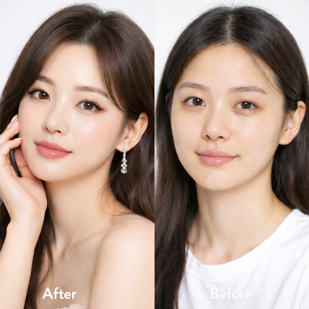はじめに自分でメイクをした状態を「ビフォー」として撮影し、その後、夢月さんにメイクしていただいた状態を「アフター」として撮影いたします。すっぴんでの撮影はございません。